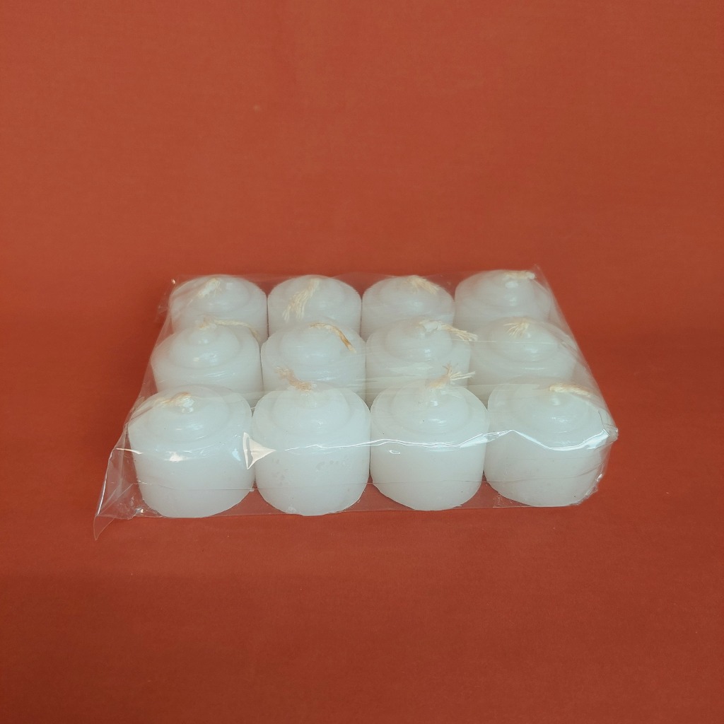 Key Details Pack includes 12 white candles. Suitable for vigil candles needs. The image shows the candles neatly arranged, wrapped individually for protection.